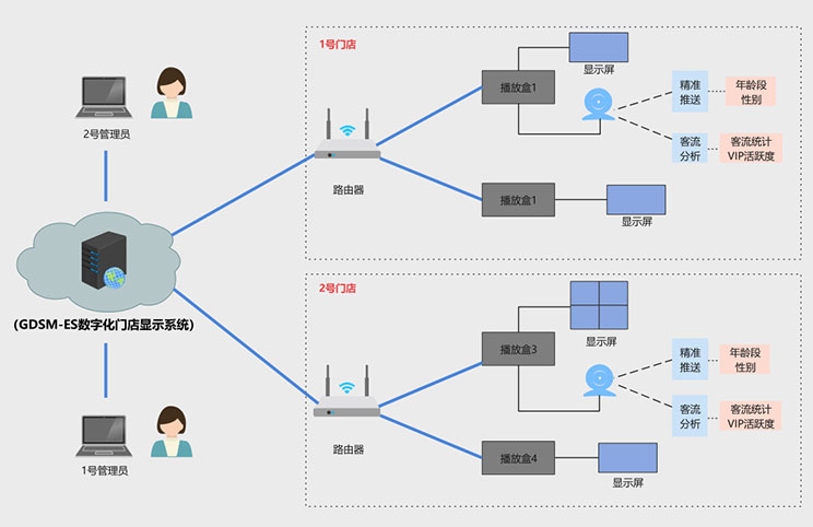 该客户为宁波地区零售门店,在一段时间内,客户发现门店销售额持续下滑,但是不知道原因出在哪里,到底是消费者减少,还是广告推送出现问题,亦或是其他原因,客户没有头绪,南宫NG·28(中国)相信品牌力量科技数据化门店显示系统完美的解决了客户痛点,方案拓扑图如下: